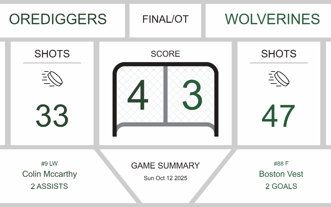 Goalies on both sides put on a stellar performance. Brayden Baxter of the Wolverines faced 33 shots and made 29 saves. On the other end, Rhett Engel of the Orediggers faced a barrage of 47 shots but managed to make an impressive 44 saves.