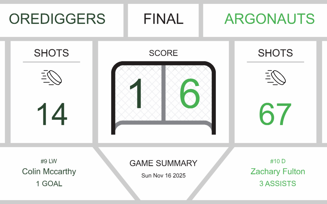 In the net, Argonauts’ goalie Josh Matthews had a relatively easy night, facing 14 shots and making 13 saves. On the other end, Orediggers’ goalie Charlie Lang had a busy night, making an impressive 61 saves on the 67 shots he faced.